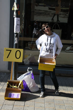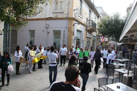 It is a sort of an urban “ladders and snakes” game where the city becomes a giant game board.-Game Pieces: Three groups of minimum six volunteers for each group will become the three game pieces. Each group member wears a white T-shirt with the appropriate color sign of EU 05: green, red and blue. The Game pieces have a steady pace along the game path, even without any players participating. It is the engagement of players that accelerates their pace. The players are invited to jump into the game pieces, for just one stop, or for the whole game.- A map of the game environment: It depicts the city environment in which the game will take place. Usually, it takes place in pedestrian roads plus, along wide sidewalks of busy roads (in Thessaloniki).-Check points: they are made of cardboard with numbered signs supported on wooden sticks. They demarcate the beginning of each step that the game pieces will perform. They are located on even distances along the game path.- A4 size yellow cardboard boxes. They are held by volunteers at each checkpoint. Each box is divided in various compartments in which the game cards are inserted. The check points become the entry point of the players. The volunteers inform the passers by who wish to play and give them an acceleration card. It will be handed out to the chosen game piece to play with. -Game cards. They prescribe: a. the spatial organization of the members of the game piece (along a line, in circle, or in lines of two or three), b. the way to move forward (zic-zac, one behind the other, one next to each other etc). c. an action to follow during 60 seconds, as soon as the game piece arrives to the following check point. The game cards are randomly chosen by the players.- A “snake” made of 15 bicycles driven by volunteers. They circulate continuously along the game environment periphery. They quite often enter into the game environment and drive across it. They trap the game pieces met along the way, and guide them backward or forward, depending on their preset path direction. They operate as a sort of snake in reference to the ladders and snakes table game.